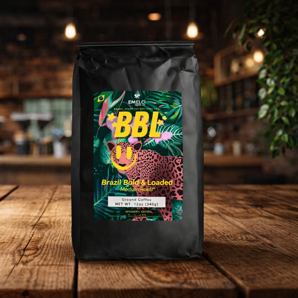 BBL – Brazil, Bold & Loaded Medium Roast • 12oz Ground Coffee This ain’t your basic Brazilian. BBL stands for Brazil, Bold & Loaded — a smooth operator with an elegant body and cocoa-kissed finish. It’s a vibe. Sourced from the volcanic slopes of Paraná and São Paulo, this medium roast balances old-school flavor with wild flair. Think: tropical jungle energy meets specialty-grade calm. Expect a clean, chocolatey profile — with a little wink of sweetness that’s perfect for daily drinkers who want to feel elevated, not jittery. 🌱 Origin Details Growers: Fazenda Santa Barbara, São Francisco, Santo Antônio Varietals: Catuai & Mundo Novo Region: Paraná & São Paulo, Brazil Altitude: 750–1050 meters Soil: Volcanic Loam Process: Pulped Natural, Sun-Dried 📝 Tasting Notes Elegant. Smooth. Cocoa-forward. Perfect for drip, pour over, or French press — no fuss, just flavor. 🔥 Warning: May cause spontaneous good vibes and an unstoppable urge to order another bag.